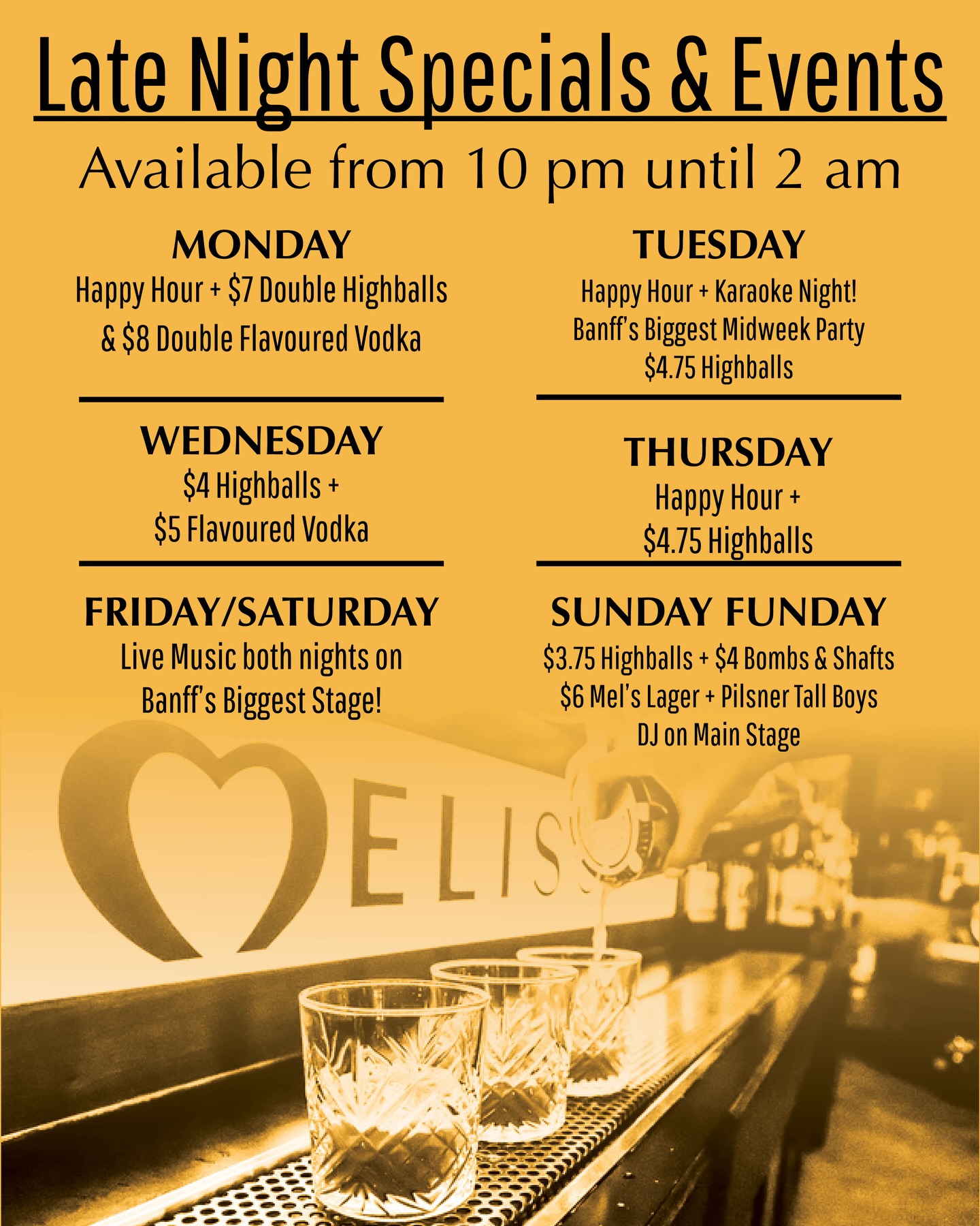 Happy Hour & Karaoke! $4.75 hiballs. Banff biggest mid-week party (10-2am) Late Night Poster *New Massive 75 sq.ft. LED TV on the stage!*