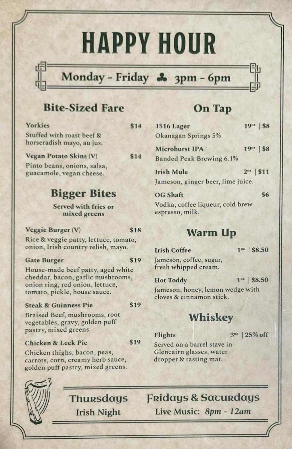 Irish Night (6pm - midnight) All Irish fare $18, Guinness $7.00, 20% off Irish whisky!