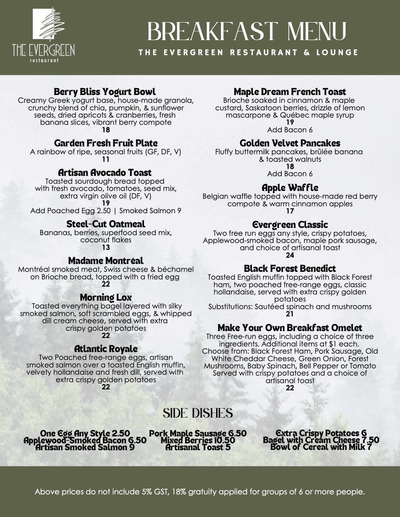 Breakfast at the Evergreen Restaurant is a delightful way to start your day amidst the stunning natural beauty of the Canadian Rockies. The restaurant offers a sumptuous morning spread that caters to a variety of tastes and preferences. From hearty traditional breakfasts featuring locally sourced eggs, crispy bacon, and fluffy pancakes to healthier options like fresh fruit and yogurt, there's something for everyone. The welcoming ambiance and attentive service make it an ideal spot for a leisurely breakfast, whether you're planning a day of outdoor adventures or simply seeking a relaxing morning with a view of Banff's picturesque surroundings. It's a truly delicious way to kickstart your day in this enchanting mountain town.
