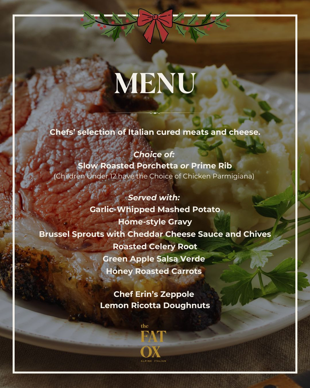 Christmas Dinner at the Fat Ox! Enjoy Chef Joe’s special family-style Christmas menu! Featuring your choice of slow-roasted porchetta or prime rib, served with garlic-whipped mashed potatoes, Brussels sprouts with cheddar cheese sauce and chives, roasted celery root with green apple salsa verde, and honey-roasted carrots. For dessert, enjoy Chef Erin’s lemon ricotta zeppole – light, golden Italian doughnuts kissed with citrus. This feature menu is available for $78 per person and $34 for children under 12 (who have the option to choose chicken parmigiana as their main course) Christmas Menu