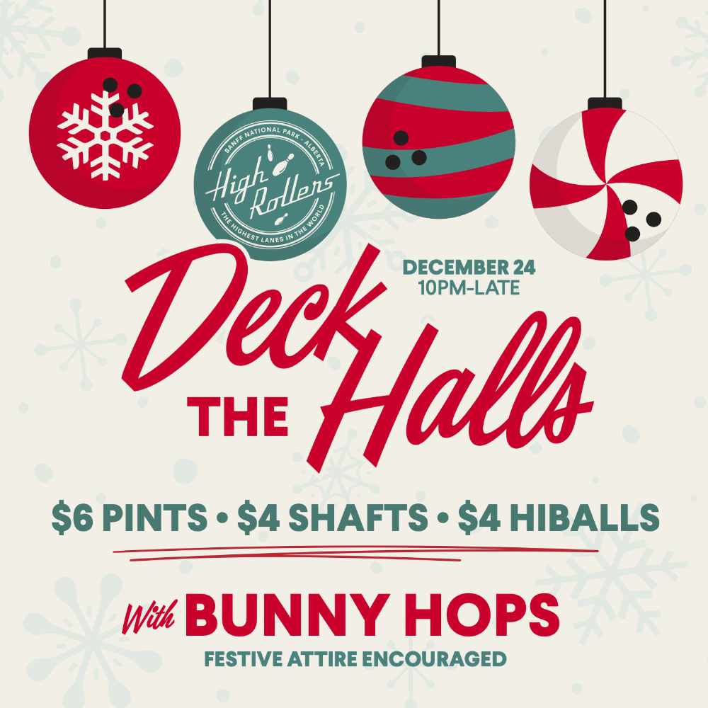 December 24th Deck the Halls with Bunny Hops! 10-Late! $6 pints, $4 shafts, $4 hiballs! Festive Attire Encouraged! Poster