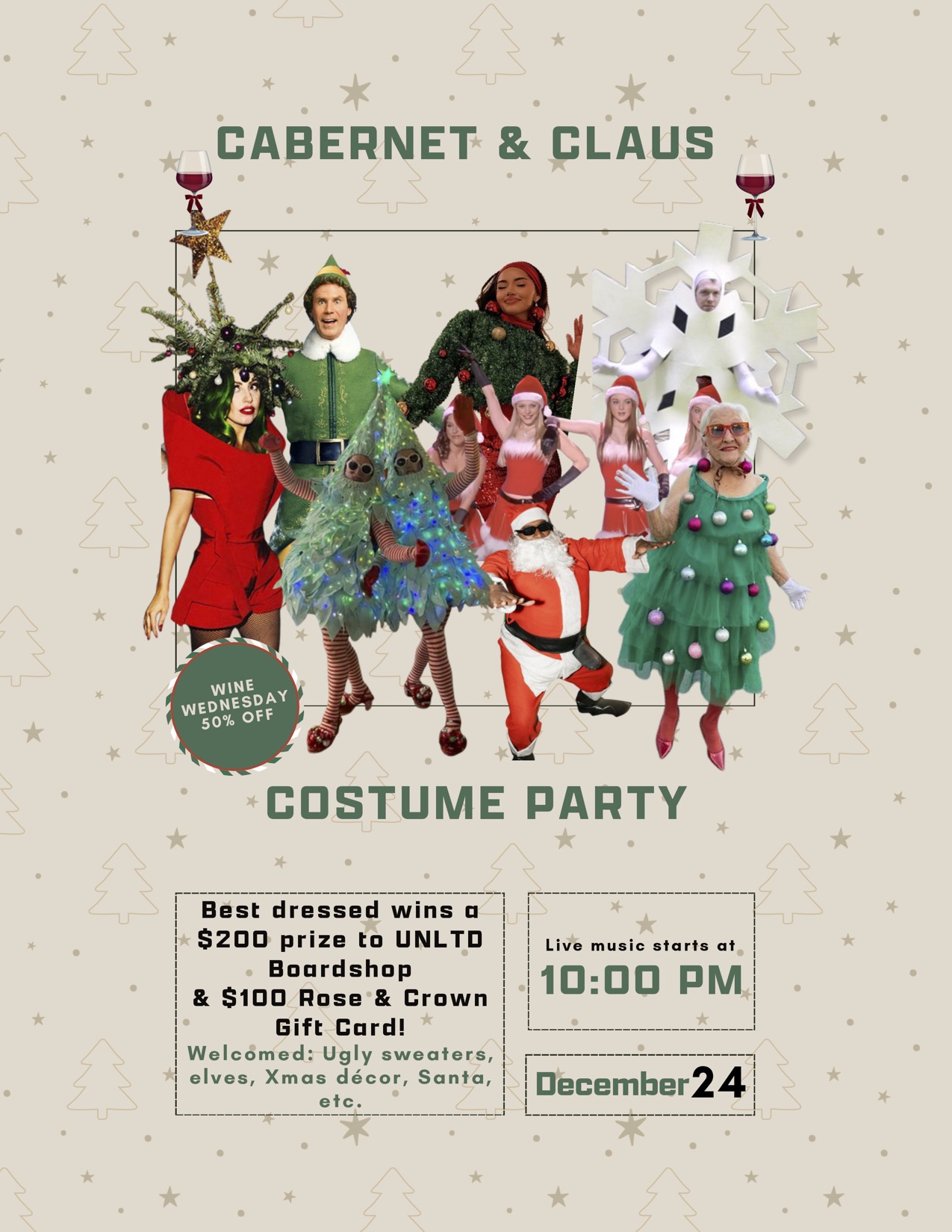 December 24th. Cabernet & Clause Costume Party! Prizes for Best Dressed! Welcomes Ugly sweaters, Elves, Xmas decore, Santa etc... Live music at 10pm! Poster